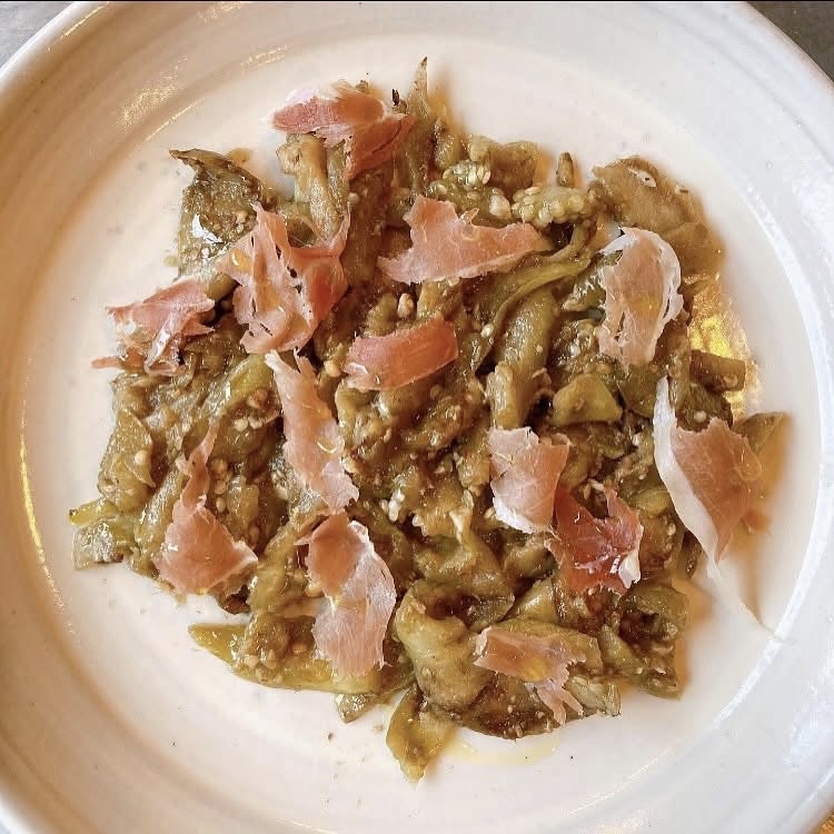 ファンが多いメニュー。皮をむいた薄切りナスをニンニクアンチョビでゆっくりソテー。生ハムは彩り程度で十分、ナスの旨みがしっかり感じられます。