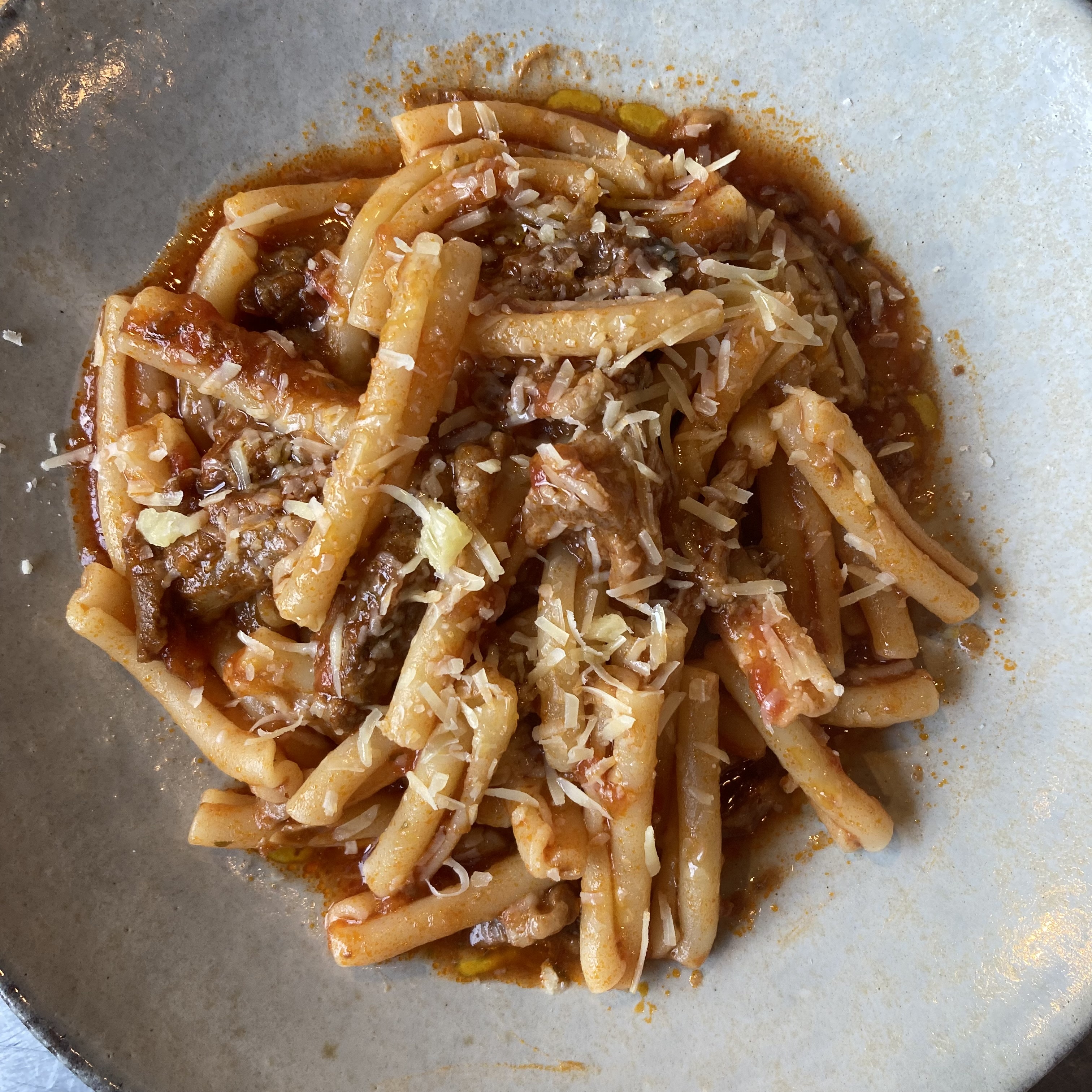 鈴木精肉店の牛スジ、もうこれだけで間違いなく美味しくなるありがたい。トマトソースたっぷりで5時間スロークッカーでとろとろに煮込んだミートソースのパスタです。
