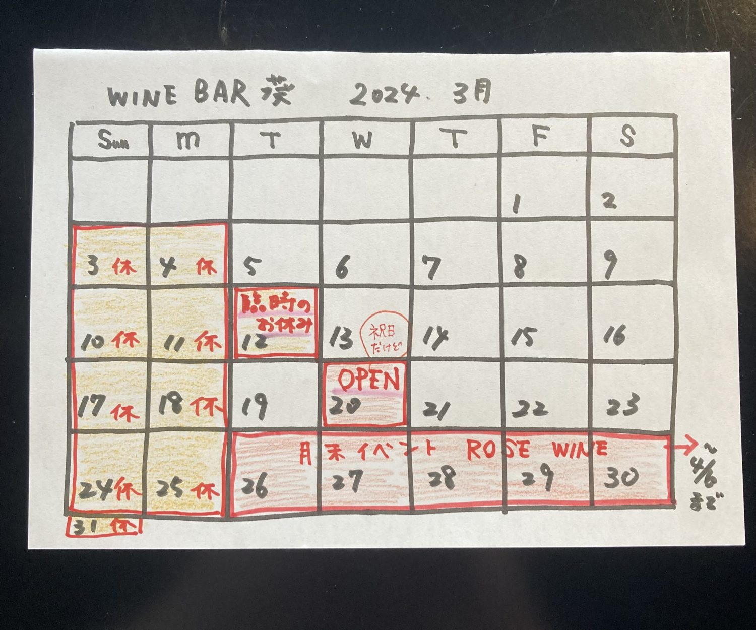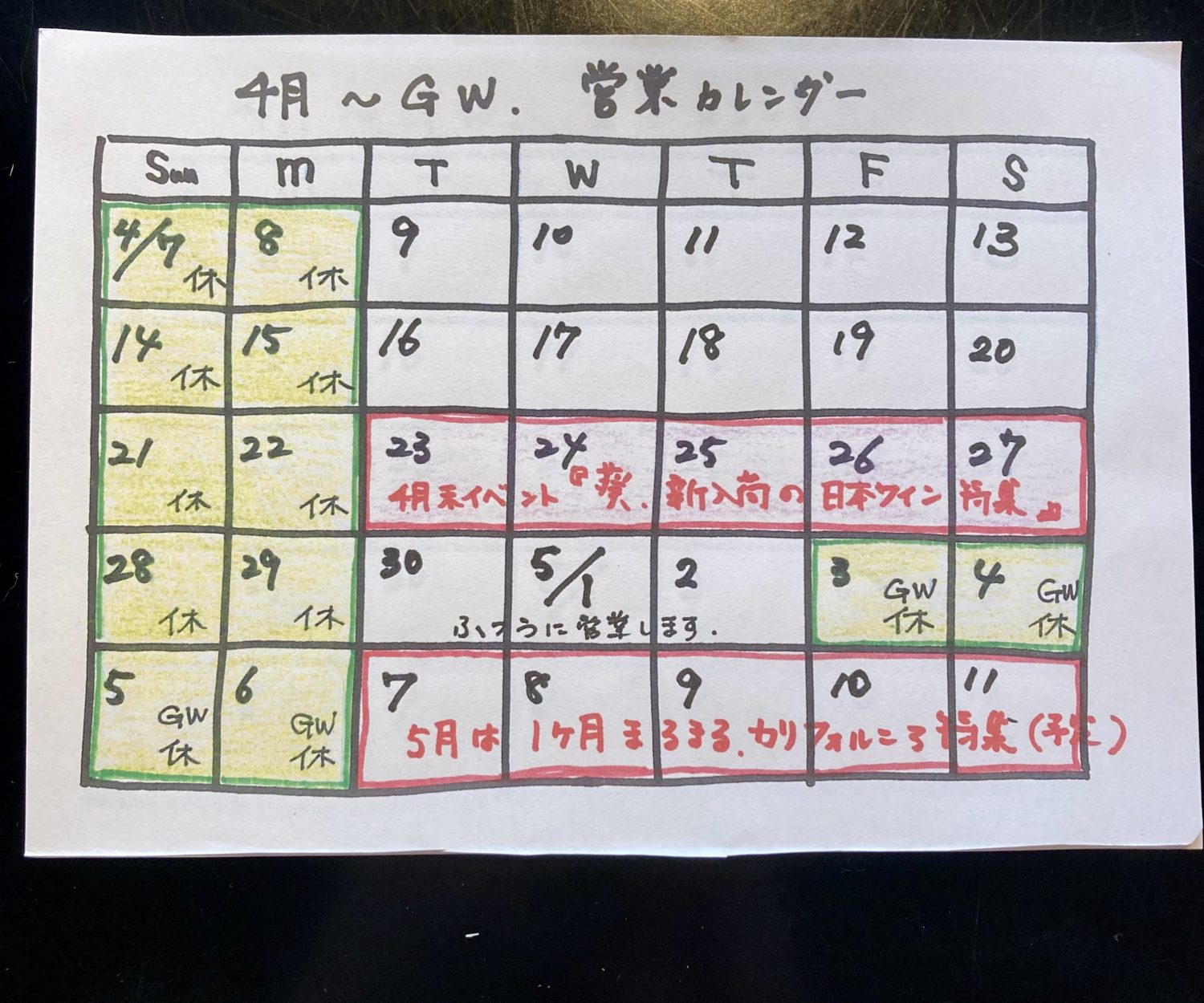今月からGWにかけての営業のお知らせ 暦通りお休みいただきます 29日は祝日休 30から2日は通常営業 3から6日、連休 明けは5月7日からスタートです 今月の月末イベントは「葵 新入荷ワイン特集」と題して、長野県小諸市のワイナリー、テールドシェルさんを中心にご紹介します。 連休明けの5月は2年ぶり、恒例のカリフォルニアワイン月間です。5月まるまる1ヶ月かけて、たくさんのカリフォルニアワインを開けていく予定です。ご期待ください。 桜もそろそろ見納め。神田川、花筏・ハナイカダ。散った花びらが川面に流れを描いて浮いて、花筏、とても綺麗な言葉です。江戸川橋で暮らすようになってから、、、