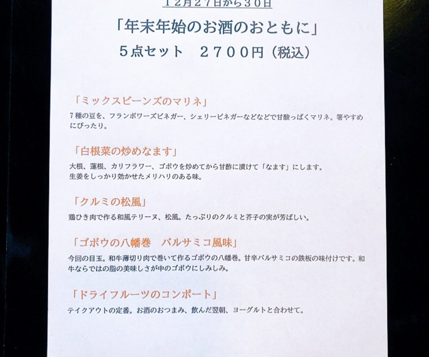 お知らせ 12月27日から30日までテイクアウトの「年末年始のお酒のおともに」を数量限定で販売します。 ・ミックスビーンズのマリネ ・白根菜の炒めなます ・クルミの松風 ・ゴボウの八幡巻 バルサミコ風味 ・ドライフルーツのコンポート の5点セット、税込2700円 以下順番にざっと。 ・7種類の豆を、フランボワーズビネガー、、、 26 12月 2021 年末年始のお酒のおともに 12月27日から30日までテイクアウトの「年末年始のお酒のおともに」を数量限定で販売します。 ・ミックスビーンズのマリネ ・白根菜の炒めなます ・クルミの松風 ・ゴボウの八幡巻 バルサミコ風味 ・ドライフルーツのコンポート の5点セット、税込2700円 以下順番にざっと。 ・7種類の豆を、フランボワーズビネガー、、、 winebaraoi