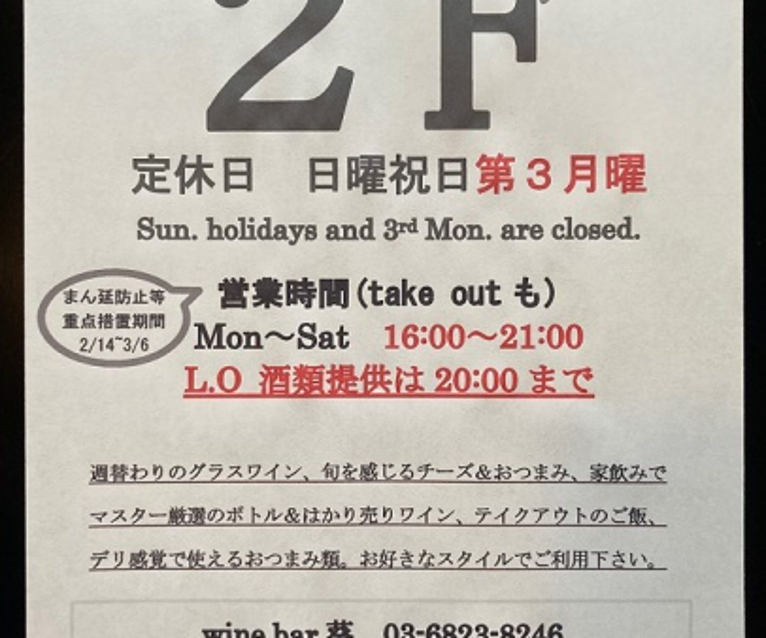 お知らせ 14 2月 2022 2月14日からの営業について 2月14日から3月6日まで、東京都のまん延防止等重点措置の延長に基づき、営業時間が以下の通りとなります。 店内営業時間 16時から21時 酒類提供(ラストオーダー) 20時 テイクアウト 16時から21時 ご来店の人数については、対象者全員検査による人数制限の緩和もおこなっておりますが、席数を間引いている兼ね合いもありますので、ご来店の前にお問い合わせください。 再び時短でご迷惑をおかけします。皆様のご理解ご協力をお願い致します。 winebaraoi
