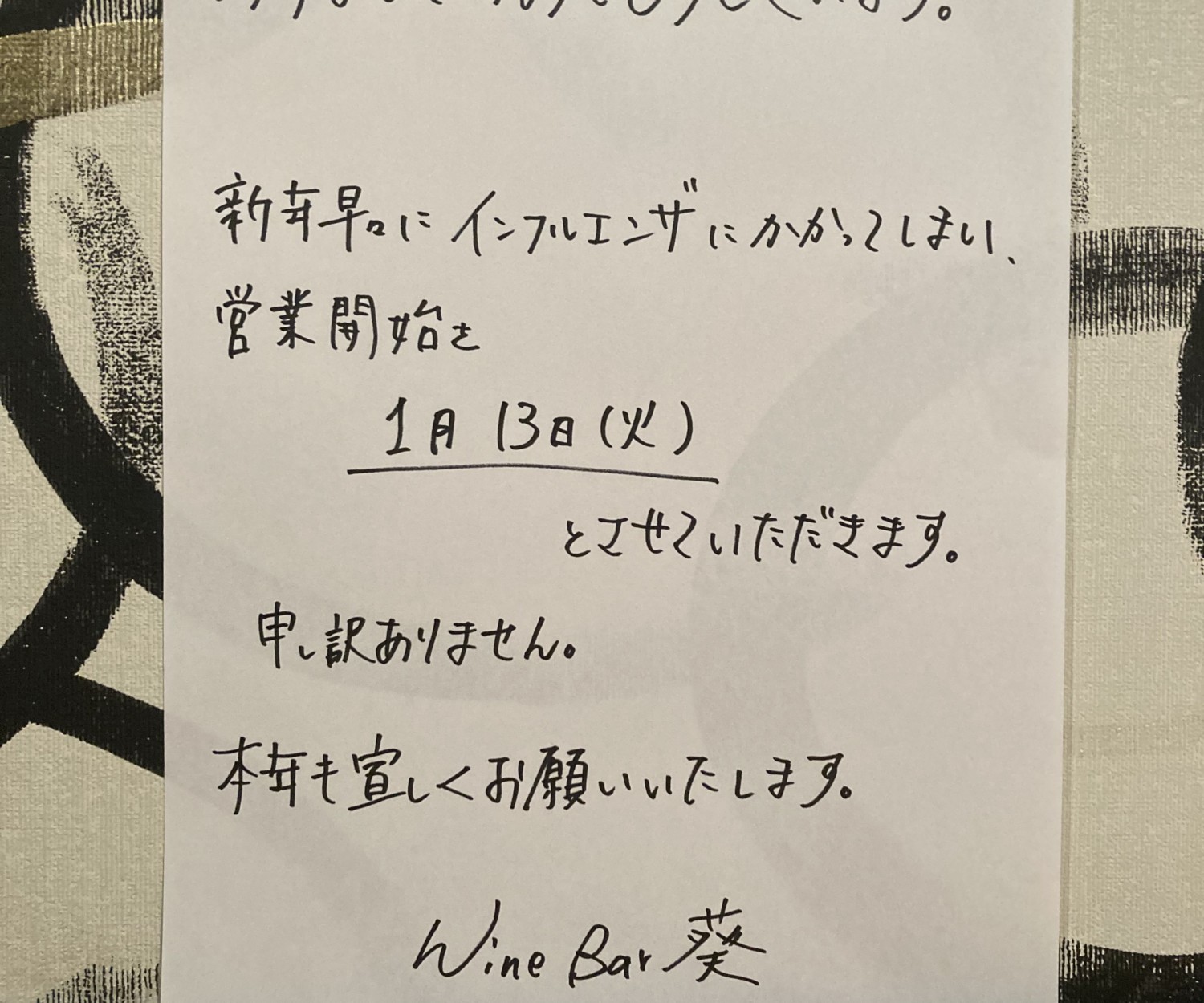 お知らせ あけましておめでとうございます。 明日7日からの営業予定でしたが、申し訳ありません、来週からになります。 よろしくお願いします。 06 1月 2026 営業13日からに変更のお知らせ あけましておめでとうございます。 明日7日からの営業予定でしたが、申し訳ありません、来週からになります。 よろしくお願いします。 winebaraoi