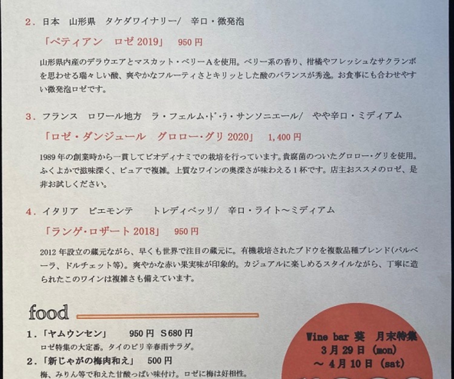 4月25日(日)からの緊急事態宣言を受けまして、 店内営業なし、ワイン販売、テイクアウトのみとさせて頂きます。 営業時間16:00~21:00 緊急事態宣言中(5月11日(火)まで)の休みは、4月25日(日)、5月2日(日)、3日(月)、9日(日)となります。 詳細はカレンダーにてご確認下さい。 5月11日(火)までの予定ですが、東京都の要請に応じて変更があるかもしれません。改めて告知させて頂きます。 ・販売、テイクアウトは事前にご連絡いただくとお渡しがスムーズです 電話 03-6823-8246 メール order@winebar-aoi.com 度々の変更となりご迷惑をお掛け致しますがご了承下さい。 宜しくお願い致します。