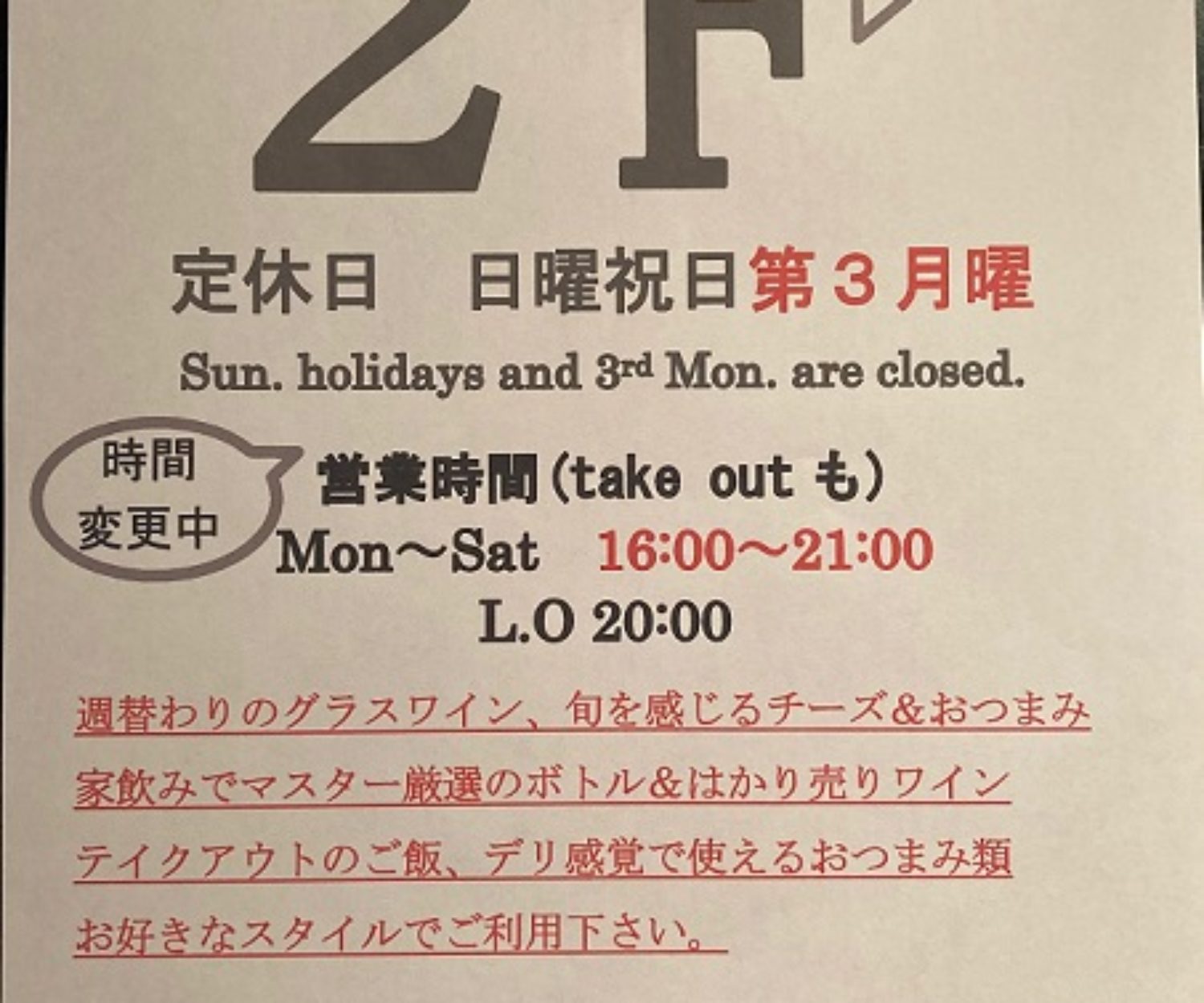 3月22日(月)からの営業時間についてです。 緊急事態宣言の終了、都からの営業時間短縮要請を受け、営業時間を16時~21時とさせて頂きます。 状況次第では再度の営業時間変更もあるかとは思いますが、その都度お知らせさせていただきます。大変申し訳ございませんがもうしばらくご協力下さい。 定休日 日曜、祝日、第3月曜日 店内営業 16時-21時 酒類の提供は20時まで ワイン販売、テイクアウトは営業時間内いっぱい承ります。 再度改めてお願いです。 営業時間を短縮している影響で、お客様のご来店時間が集中することがあります。 また、席数も減らしての営業のため、お席のご案内がスムーズにできないこともあります。 ご来店の際には、直前でも構いませんので、お電話でご確認、可能なことなら前日までのご予約を再度お願い致します。 カウンター席は4席です。お一人でご来店のお客様を優先したいので、お二人以上の場合はテーブル席のご案内を基本とさせて頂きます。 テイクアウトも事前にご予約頂けると大変助かります。 ご面倒かと思いますが、ご理解ご協力をお願い致します。
