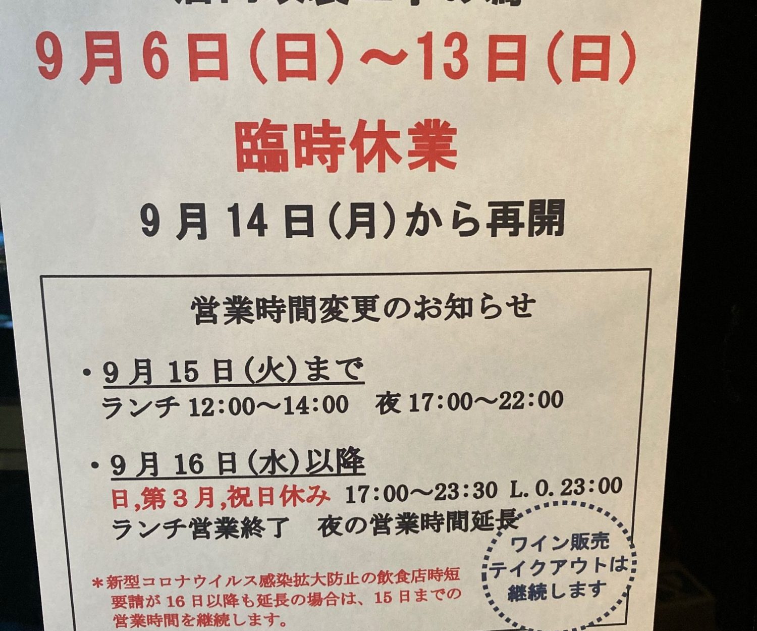 本日からのテイクアウトメニューです。店内でも山梨、金井醸造場さんの「ヴィノ・ダ・万力 カベルネ・ソーヴィニヨン メルロー2013」を抜栓。ご都合に合わせて使い分け頂ければと思います。前菜&おつまみ New!かぼちゃとクルミ クリームチーズのサラダ 550円、焼キノコと蓮根のマリネ 550円、鶏肉のスパイスピクルス 550円、キノコのキッシュ風オムレツ 600円、椎茸チーズ焼き 海苔佃煮&トマトソース 650円、蒸し茄子 ピリ辛エスニックソース 700円、蓮根とパンチェッタのきんぴら 800円、New!グラニースミス(青りんご)のカスタード焼き 600円、ドライフルーツのコンポート 650円、この中からおまかせで盛り合わせ3種750円、5種1080円もできます。内容はお尋ねください。
